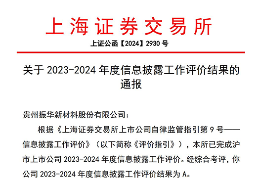 振华新材荣获上证所信息披露工作A级评价