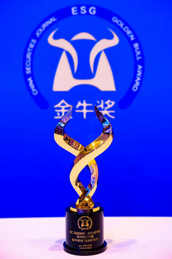 12月6日,由中国证券报和中国国新控股有限责任公司联合主办的2024金牛企业可持续发展论坛暨第二届国新杯·ESG金牛奖颁奖在上海青浦举行。振华新材凭借在绿色低碳发展方面的突出表现,荣获“ESG金牛奖碳中和二十强”称号。
